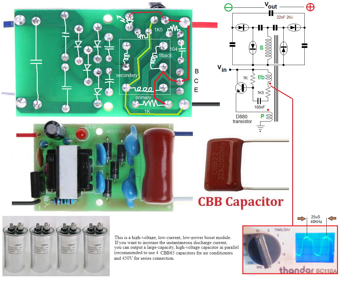 Manufacturers spec' DC 3.7V to 1800V "boost module" Can work continuously (100% duty cycle) Max recommended input voltage 4.2V Input current may be up to 2A Exercise safe working practice because of high-voltage electrical shock hazard Output capacitor (22nF 2000V rating) may retain hazardous charge after switchoff ! Size 41 x 26 x 20mm Cost AUD$5 ea (3Q 2019) The circuit is tradionally known as a "blocking oscillator" The transistor is initially biassed 'on' by current flow thru its base resistor Collector current steadily rises due to transistor amplifying action. When the transistor (and transformer core) saturates (current value levels out) The rate of change of current flow is such, that by transformer action a pulse is induced in feedback winding Because the pulse polarity; transistor is biassed-off (this is 'blocking') Collector current drops to zero. Collapsing field in primary produces a potential in the secondary by transformer action obeying the law of electromagnetic induction. Cycle then repeats (ad nauseum) i.e. oscillation Frequency of oscillation measured at 37 - 60KHz (depending on supply voltage) Secondary voltage is rectified in a dual "peak-clamp" type, voltage quadrupler circuit. The voltage quadrupler circuit gets the most from the least, I have sucessfully used it in a CRT test jig to obtain the necessary high voltage. © 3Q 2019 |