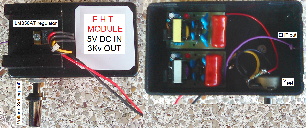 My initial setup looks promising in bench tests. Two modules are connected so: DC supply inputs paralleled, outputs in series aiding. Output is "fully floating" and in no way electrically connected to the input ccts. Variable voltage input is from LM350AT 3 terminal adjustable regulator. (see schematic) DC supply input was optimum at 5 volt, the heatsink then being only warm with the 550mA current. Higher inputs i.e. 12V meant the heatsink getting hot in wasting power across the LM350T. EHT voltage output measured on (high input-impedance) DMM by using 100:1 ratio resistive voltage divider. With 2 modules connected as shown in schematic a 2.5 volt supply will give 1500V x 2 = 3000V A variable pot' in the voltage supply regulator allows control up/down the high-tension output