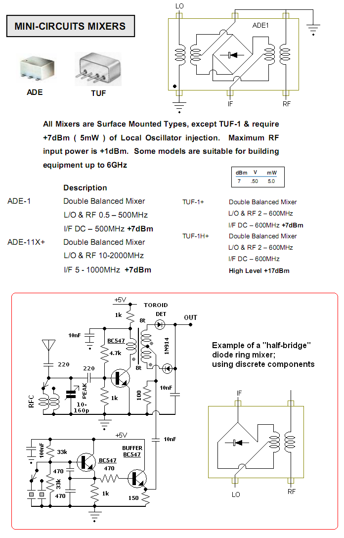Definitions: RF/LO FREQ: Range of the RF and LO frequencies for stated specs. Mixers can be operated below lowest frequency cited with some degradation of conversion loss and port-port isolation values. IF FREQ: Output range of the IF frequencies. All DBM's will allow an IF down to DC, as they are also used as phase detectors (a dc voltage representing a very small difference between the LO and RF ports). This allows them to be used as a product detector as well (audio frequencies). LO DRIVE: Recommended LO drive level, and the level for which the other specifications are based. Note that on the LEVEL 7 mixers, the slight degradation of specs when operated at a lower LO drive. On the otherhand, if you drive a LEVEL 3 mixer with =+7dBm LO, the conversion loss and isolation improves, so it won't hurt to use a lower drive device in a circuit originally designed for LEVEL 7's. CONVERSION LOSS is the loss in dB from the RF input signal to the IF output. As a general rule of thumb, most DBM's have a conversion loss in the 5-7dB range. This is easily made up by a post-mixer IF amplifier. Note that the conversion loss is listed for both Level 7 and Level 4 mixers, to show the slight difference in driving a Level 7 mixer with only +3 or +4dB of drive. Figures are based on the data sheet values for 5-10MHz. In the case of the Level 3 or 4 mixers, driving them at Level 7 will improve the loss a bit. ISOLATION lists the port-to-port isolation of the device. RF-LO: The attenuation of power from one port to the other. Values shown are for the intended LO drive for that device. For example, with +7dBm LO drive on the ADE-1, there is -66dB of isolation to the RF port, or -59dBm of LO power. However, in a direct- conversion receiver, this -59dBm of LO power appearing on the RF port equates to a fairly strong signal still! In a superhet receiver, it is normally far enough removed from the RF frequency to be of little concern. LO-IF: the attenuation of the LO port power to the IF port, and vice verse. On the ADE-1 with +7dBm LO drive, and -55dB isolation, -48dBm LO power could appear on the IF port. For a receive or transmit mixer, not a concern, but if used as a product detector or direct conversion receiver, this could present a problem with reciprocal mixing products. In the "ideal mixer," there would be absolutely no RF or LO appearing on the IF output, or absolutely no LO power appearing on the RF port. In the real world, however, it's not quite this clean. Thus, the isolation specs are important for identifying the "real world" leakage in the mixer. HOWEVER ... no matter how poor the isolation specs may be on a DBM, it's still tens of dB better than an active mixer such as the NE612!!! Now notice the specs again for the new ADEX-10L. It is designed for only +4dBm of LO drive, which is 355mVrms or about 1Vpp on a scope. It can be driven with a single transistor crystal oscillator, feeding the LO port via a 47 ohm resistor and .1uF cap for an approximate 50 ohm match. This scheme delivers about 1Vpp to the ADE-1L LO port, or at the design spec. This prevents having to add a buffer driver transistor. The ADE-1 and ADE-1L provide a nice clean output at 10.1 MHz, but there is a little 1.9MHz amplitude modulation on it ... due to the VFO (LO) port power leaking into both the LO (12MHz) and IF (10.1MHz) ports. This 1.9MHz modulation shows up at the antenna terminals, following the class C PA on a spectrum analyzer, which is unwanted power. It is knocked way down on the class E version of the PA, since the 10.1MHz from the mixer is amplified and turned into a square wave by a high speed comparator, effectively removing the 1.9MHz element. This port-to-port leakage is such that on an o-scope, you can see 12MHz on the 1.9MHz VFO output, and 1.9MHz right at the 12MHz crystal oscillator. What is needed, is a bit more port-to-port isolation in the mixer. (As stated above, this is nothing compared to the poor port-to-port isolation offered by the NE612). But look at the specs of the new ADEX-10L. It has an LO-RF port isolation of 80dB! That's 15dB or so better than most passive mixers. Even though they are LEVEL 7 mixers, driving them from a single transistor oscillator at only .8-1Vpp causes little degraded performance in the HF part of their frequency range. And while a DBM will LOSE power in the mixing process (conversion loss), the much higher port-to-port isolation does much to prevent chirping, pulling of the VFO and other effects experienced by the active mixers. For new designs, I would consider one of the Level 3 or 4 mixers now being offered, such as the ADE-1L and ADEX-10L listed above. For more information on MiniCircuit DBM mixers, visit the website for data sheets and application notes. |