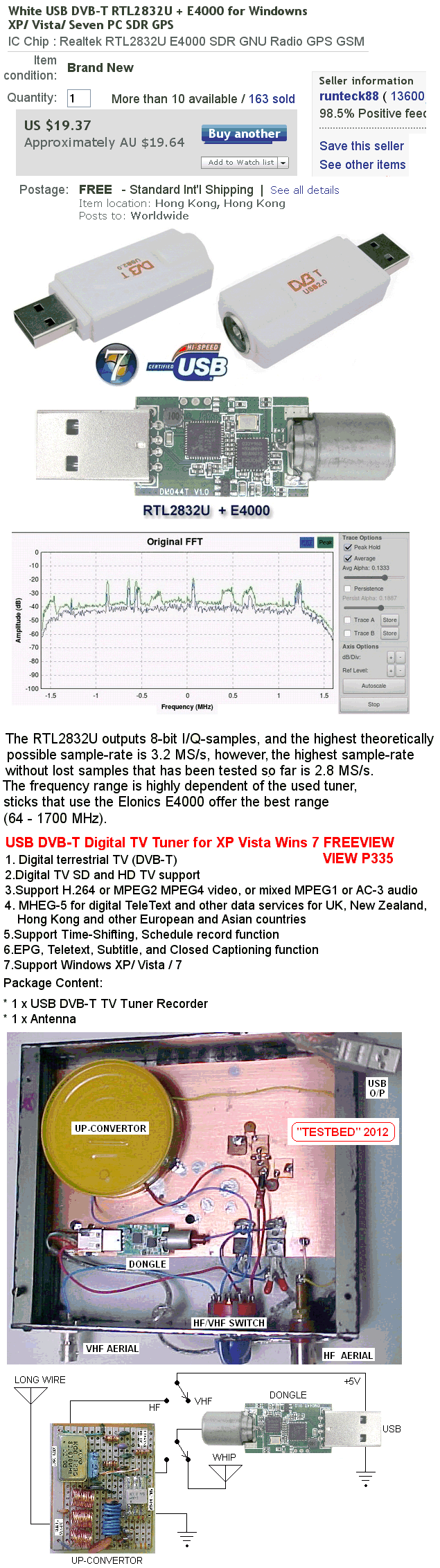For a well written analysis of up-convertors and the "RTL2832 dongle" see: http://f5rct.free.fr/explorer/Documents/Banc.Essai/HFconverterReport.pdf For a critique of the "RTL2832 dongle" w.r.t. poor RF sensitivity, see: http://www.vklogger.com/forum/viewtopic.php?f=23&t;=10527#p24765 |