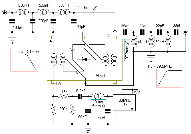 Based on the success of others (above); One could construct and connect this HF "up-convertor" This will then translate the MF/HF spectrum (0.5~30MHz) to within the tuning range of the "dongle" (64~1700 MHz) 0.5 MHz is the lower limit of the ADE-1 passive/diode mixer. (0.5-500 MHz +7dBm) Filter inductances are easily measured using my LC meter, and a good starting point is to use an on-line calculator like that from Harry SM0VPO, to estimate Nr of turns, coil diameter etc. The low-pass and high-pass filters are based on standard designs that I found in my 1975 ARRL handbook (pg 50) "click to enlarge"