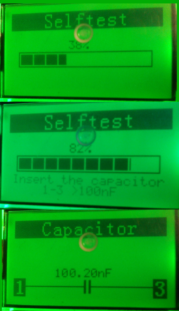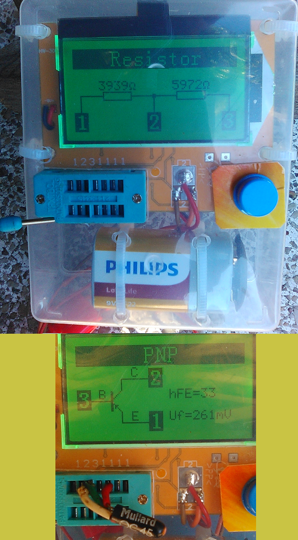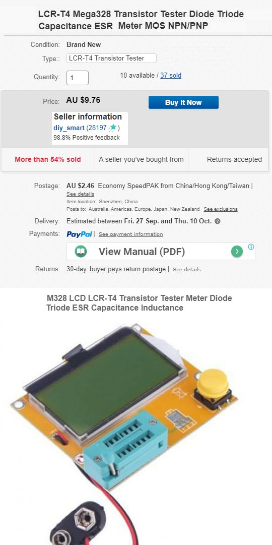 1. 2013 latest M328 version of the software , more functions. Chip: Atmega328 2. 128 x 64 big Backlight LCD display, only 2mA when stand by. 3. Using 9V battery (Not included) Test ranges: Inductors, capacitors , ESR, diodes, dual diode , LED, MOS, transistor, SCR , zener(< 4v) Resistance, Adjustable potentiometer Resistance : 0.1Ω resolution, maximum 50MΩ Capacitor : 25pf -100,000 μF Inductors : 0.01mH-20H Function: 1: Automatic detection of NPN and PNP transistors, n-channel and p-channel MOSFET, diode (including double diode), thyristor, resistor and capacitor and other components 2: Automatic test the pin of a component, and display on the LCD 3: Can detect the transistor, MOSFET protection diode amplification coefficient and the base to determine the emitter transistor forward biased voltage 4: Measure the gate and gate capacitance of the MOSFET threshold voltage 5: Use 128 x 64 liquid crystal display with green backlight Specifications: 1. One -button operation, automatic shutdown . 2. Only 20nA shutdown current. 3. Automatically detect NPN, PNP bipolar transistors , N -channel and P -channel MOS FET, JFET , diodes , two diodes, thyristors small power unidirectional (SCR) and bidirectional (Triac) thyristor. 4. Automatic identification components pin arrangement . 5. Measuring bipolar transistor current amplification factor and base - emitter threshold voltage. 6. Via the base - emitter threshold voltage and high current amplification factor to identify Darlington transistors. 7. Can detect bipolar transistors and MOS transistors protection diodes. 8. Measuring the gate MOS FET threshold voltage and the gate capacitance. 9. Can simultaneously measure two resistors and resistor symbol is displayed. Displayed with a 4 digit number. Resistance symbol (Ω) on both sides shows the pin number. So you can measure a potentiometer. If the potentiometer wiper is not transferred to an extreme position , we can distinguish the middle and both ends of the pin. 10. Resistance measurement resolution is 0.1 Ω , 50M Ω can be measured . 11. Can measure capacitance 30pF-100μF , resolution 1pF. 12. 2uF more capacitors can simultaneously measure the equivalent series resistance ESR values. The two can be displayed with a decimal value , resolution 0.01 Ω 13. Can be in the correct order and the diode symbol display two diodes , and gives the diode forward voltage. 14. LED is detected as a diode showing a higher forward voltage. Combo of the LED is identified as two diodes. 15. Reverse breakdown voltage is less than 4.5V Zener diode can be identified. 16. Can measure a single diode reverse capacitance. If the bipolar transistor connected to the base and collector or emitter of a pin , it can measure the collector or emitter junction reverse capacitance . 17. Rectifier bridge connection can be obtained with a single measurement . Notice: Before measuring capacitance , the capacitor must be fully discharged , otherwise meter damage is very likely . Link: EEVblog video about Component Tester LCR-T4 (429,000+ views, upload Sep 5, 2017) EEVblog #1020 - Is A $7 LCR / Component Tester Any Good? FOUND IN COMMENTS: Cloned from the tester developed by Karl-Heinz Kübbeler and Moritz Augsburger. https://www.mikrocontroller.net/topic/248078 It was a german project and after short time copied in china ! If you connect leads 1, 2, and 3 together and press the test button, it will run a self test During test, screen prompts will request; unshort the leads, and connect a capacitor of >100nF to complete 'selftest'