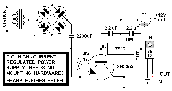 The circuit shown above is for a positive regulated DC supply that uses commonly available components. It is a variation of a well known design, but differs in the fact that it uses a negative three-terminal regulator (79xx etc) and a 2N3055 NPN 'pass' transistor which is directly chassis mounted. This provides a heatsink, and establishes the ground point of the circuit through the Collector's metal case mounting point. The advantage being of course; no insulating mounting hardware for the 2N3055 is required. It should be noted that this arrangement precludes an incoming (unregulated) voltage that has the negative side tied to chassis ground (standard practice) - i.e. a floating input is needed. Minimal current flows through the 3-terminal regulator, so this need not be heatsinked. Because of its simplicity, there is no real over-current protection, so any short circuits on the output would be best avoided! Use a 3-term regulator from the 79xx family, available 5, 8, 12, 15, 24 volt etc, the incoming DC supply voltage should be 20% - 50% higher than the regulated dc output voltage, for efficient operation and ensuring that there will be sufficient current available to supply the load.