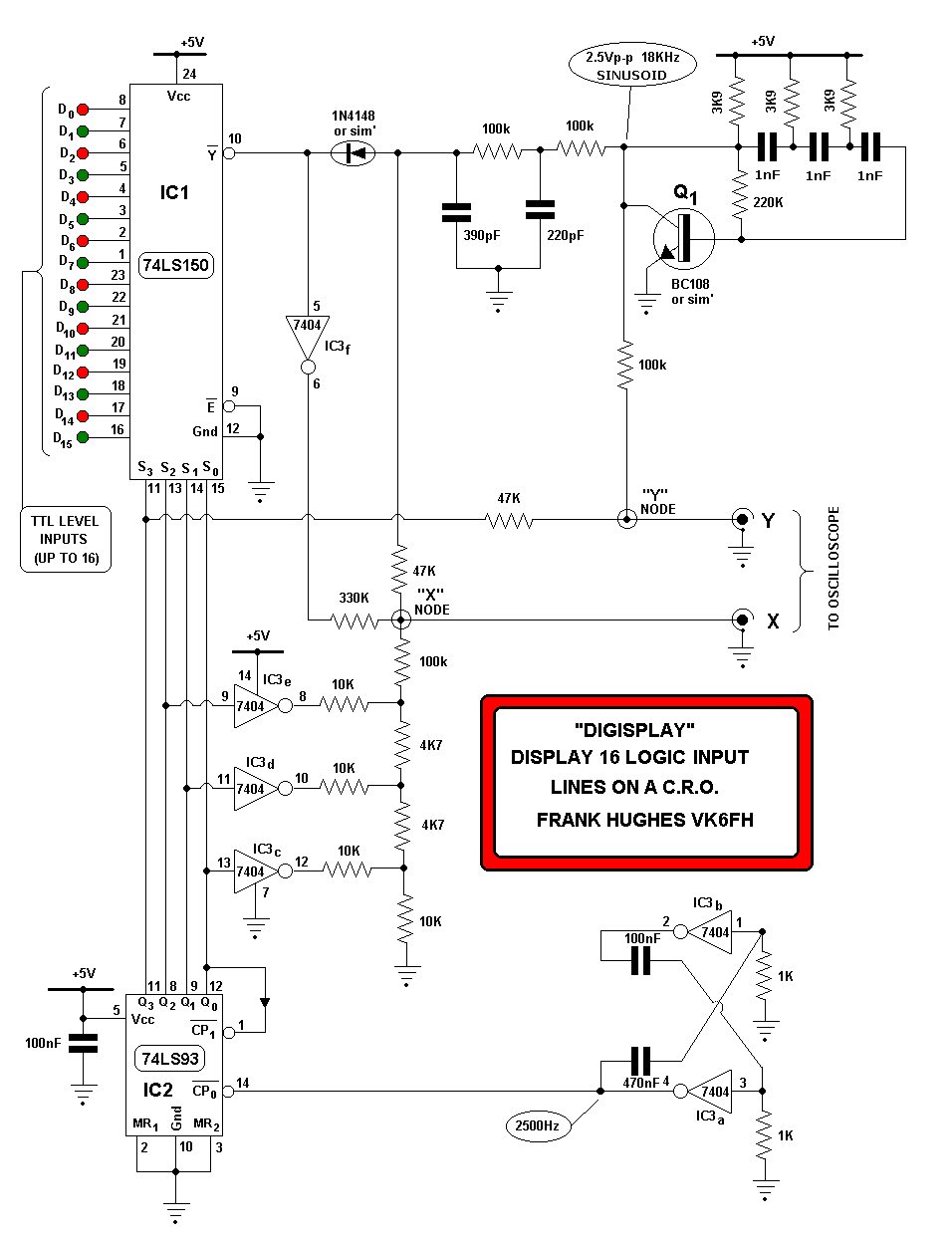 This circuit will simultaneously display the steady-state condition of up to 16 digital lines as two rows of 8 characters on an oscilloscope screen. Interface with the unit is; 16 inputs (must be "TTL" level, i.e. +5v or 0v ), X and Y outputs to CRO (which can be a lower performance type) and 5v dc to power the electronics.