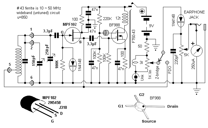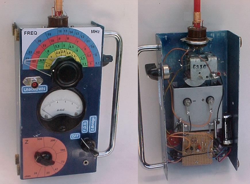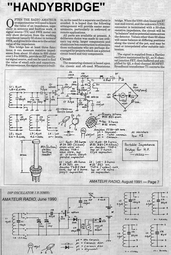 IMPEDANCE BRIDGE This is a design based on 2 well regarded circuits sited in Amateur Radio (Australia) magazine, (see ref's below.) It is essentially the Impedance bridge design (ref 2). However: by observation it is apparent that the "variable frequency oscillator" section is essentially the same circuitry as the earlier published "Fet Dip Oscillator" (ref 1) LINK TO FET DIP METER (my construction) Additionally a diode "clamp" is now shown b/w JFET gate and gnd. The diode clamp limits +ve going excursions which aids oscillator stability and reduces harmonic o/p by limiting device transconductance on peaks. This reduces changes in junction capacitance which restricts varactor action. The diode is most effective when a source bias resistor of 100 ohm paralleled with 10nF of capacitance (Ref ARRL h/book 1986 pg 4.35) Therefore it was easy to COMBINE both designs, and add a "changeover" switch (for the meter circuit) which would then allow a dual- purpose of being a FET Dip Oscillator, OR an AC bridge (impedance) measuement device. (consult schematics below) In the FDO position the meter indicates Oscillator relative output and you should look for a "dip" in meter reading as Freq control is rotated; (showing the resonance of the nearby tuned circuit) In the Z-bridge position the meter is used as a null detector the reading (at best null) on the calibrated Z potentiometer indicating the Impedance of the "unknown" connected to the input (i.e. antenna etc) The dial calibration of frequency (for each of the 4 plug-in coils) is determined by listening for the swish/plop of the VFO in a good receiver. The working calibration is then flatbed scanned and a colourful artworked dial scale printed using the PC. Likewise the Z (impedance) dial scale is determined by empirical measurement of fixed value carbon type resistors 10 thru 220 ohm. Likewise an artworked and printed scale is printed from the PC. Ref 1: Amateur Radio June 1990 Dip oscillator 1.8 - 30 MHz VK3XU Ref 2: Amateur Radio Aug 1991 Portable Impedance Bridge for HF VK3XU |