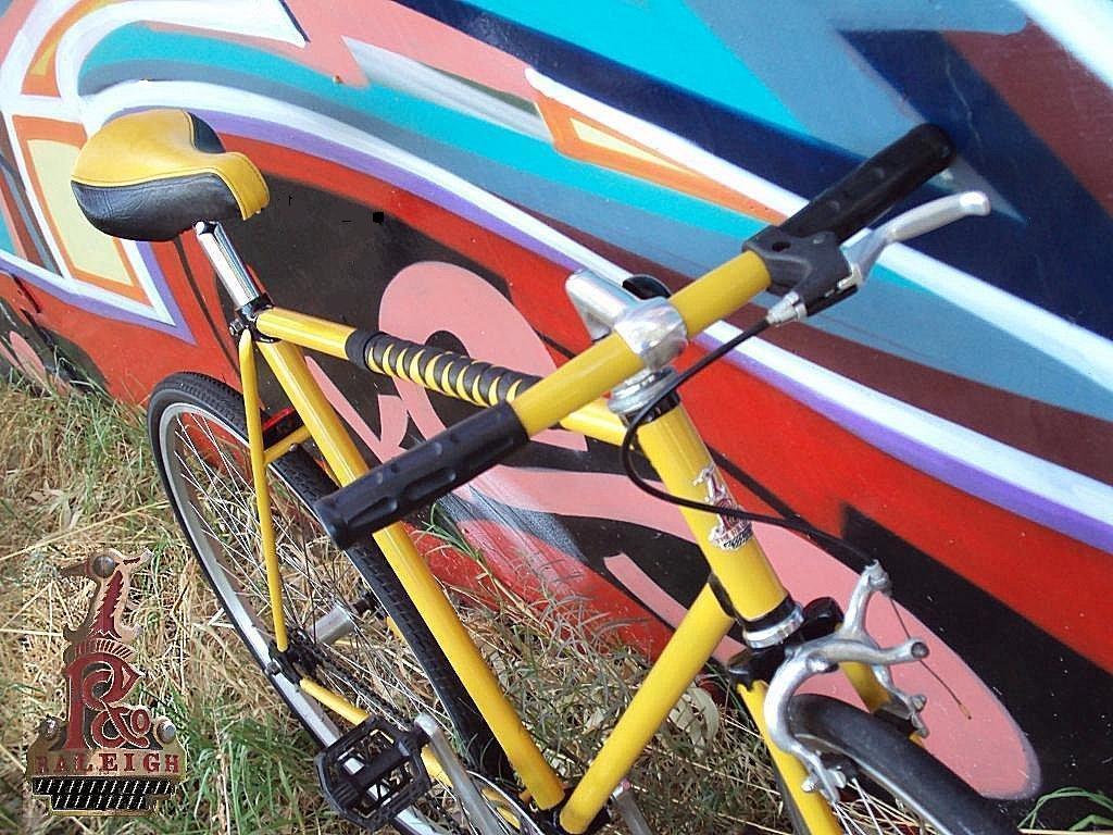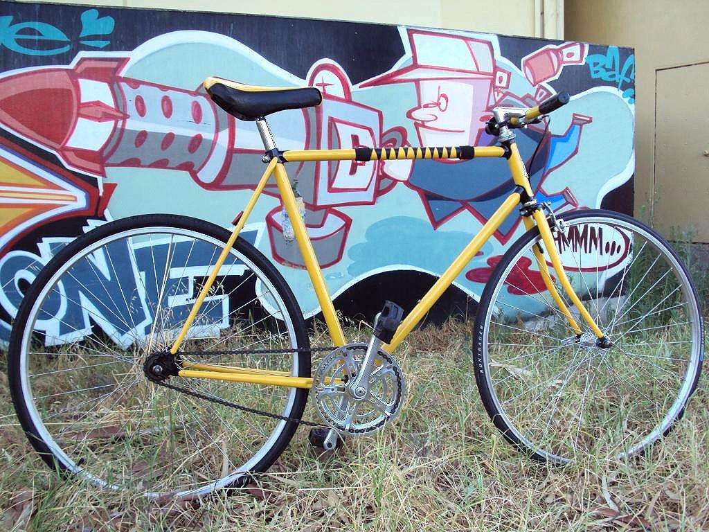 Fixed wheel type bike constructed Jan 2012 Click pictures to enlarge: Raleigh CrMo frame Top-tube 58cm C-C Down-tube 58cm C-T Gear ratio 52:16 Top-tube protect Diamond pattern Vinyl Re-upholstered saddle Photo shoot: Osborne Park W.A. (western wall - Mitchell Freeway) 150M south of King Edward Rd footbridge. Inspiration: fixedgeargallery See also: fixedgeargallery feature |