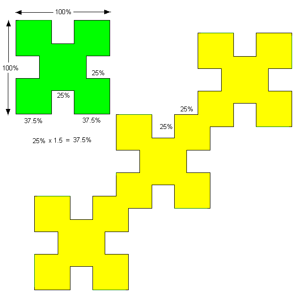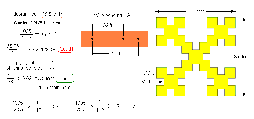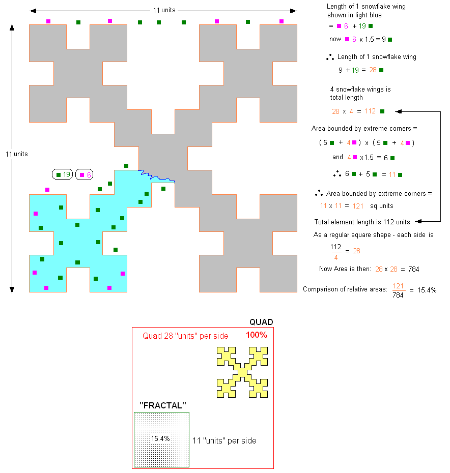 The radio antenna shown uses a fractal shape for the various elements (reflector/driven/director). By scaling from the photo, the basic snowflake shape has the following proportions: The relation between any long and short dimension is 1.5 times (see diag') the rest of the antenna is just a co-joining of the same basic snowflake shape. Using a green spot to 'tag' the short-span and pink dot for long span; we can do some simple arithmetic to determine the relative dimensions of the antenna We are just measuring in "units" Later; the operating frequency can be factored in, to give absolute dimensions, therby giving a plan for antenna fabrication. Remember pink span = 1.5 times green (in length). We can see the fractal shape occupies only 15.4% of the cross-sectional area of the conventional "quad" antenna Using well regarded design formulae for a cubical quad (but using the snowflake fractal instead of the regular geometric square)