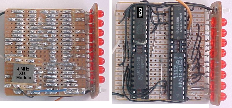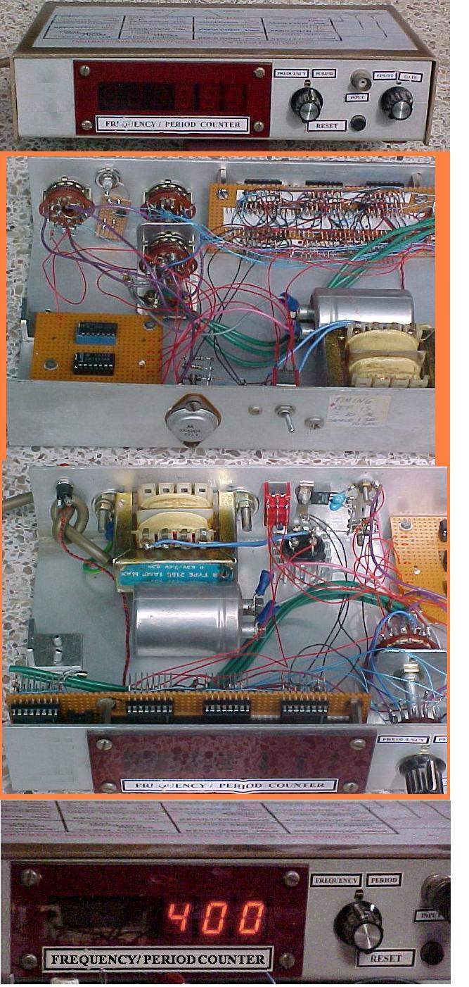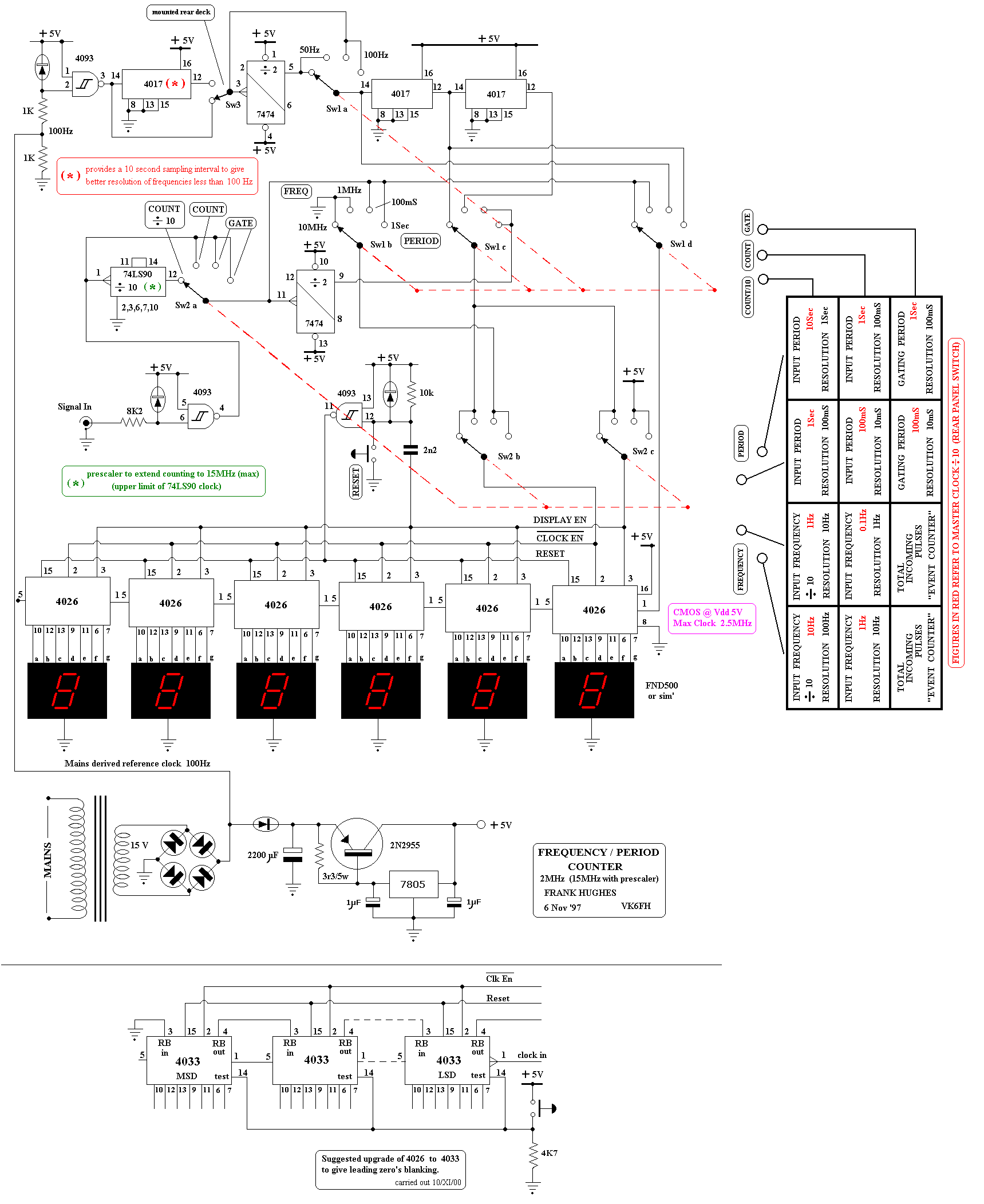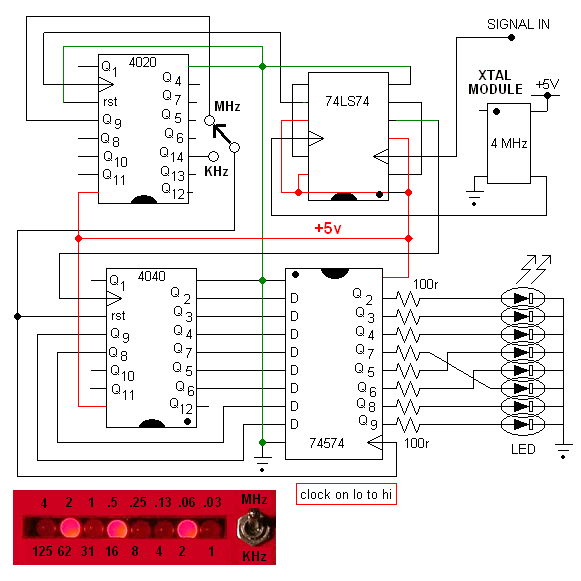 Will measure and display frequency or period. Also useable as an event counter. Upper frequency count limit is about 2 MHz (or 15MHz in the divide by 10 count position.) 50Hz Mains frequency is used as a reference for all needed frequencies and timings. We are informed that AC mains frequency is held to close tolerances, therefore the frequency counter should display a similar degree of "accuracy". Uses 6 off 7 segment displays for readout. There are many good circuit designs that have a much higher frequency limit, but this basic design uses only CMOS and TTL family IC's (cheap and readily available). Inspired by the work of Onno PA2OHH this is my build of the LED display frequency counter. The circuitry and operation is very simple, the only trade-off being that the display must be interpereted from the state of 8 adjacent led's: the frequency count being the aritmetic "sum" of the illuminated LED's. This you must do mentally or with pen & paper, but your eye/brain adapts suprisingly quickly to this presentation. My example was constructed from mostly reclaimed componentry and made to fit in a small metal enclosure. (mustard tin again!) The need for such a device arose from having to measure (in particular) the VFO frequency of the SDR detector shown elswhere on this site. A 4020 14 stage ripple counter, which gates on/off the 4040 12 stage ripple counter is used to count the incoming signal frequency. Half of each cycle is used for counting the incoming signal. On the second half of the cycle, the count is latched in a 74HC574 IC and the 4040 is reset to zero. The state of the latched count in the 74HC574 is displayed on a row of LED's. The 8 LED's indicate a frequency value of 4, 2, 1, 0.5, 0.25, 0.13, 0.06, 0.03 (MHz pos'n) and 125, 62, 31, 16, 8, 4, 2, 1 (KHz pos'n) Because I have used 'B' 4000 series logic IC's the maximum frequency limit (at 5V rail) is about 4MHz. I really should have used the 'HC' (high speed CMOS) family variant; for which the upper frequency limit would not be a consideration. (c 50 MHz) However; once again I have used that which I had readily at hand! A 74LS74 configured as a divide by 2, D flip-flop; acts as a "prescaler" for both the "clocking" reference (4MHz xtal oscillator) and also the input signal. The 4MHz quartz oscillator module is used for timing, and 'accuracy' depends on the stability of this unit, which for my purposes is really quite good enough. Upper freq' limit spec' for the LS family is about 25 MHz. This then means; an upper freq count limit of about 8 MHz (sufficient to cover the 7~7.5 MHz range of the VFO) can be acheived. Limited by the capability of the IC's and also the frequency readout. In the MHz switch pos'n the counter displays the most significant 8 highest 'bits' of the count. Accuracy here would then be 1 part in 255 (about 0.4%) In the KHz position the counter is over-run (several times) however provided the input signal is stable we read the truncated frequency count accurate to 1KHz. Arithmetic addition of the two readings will give a figure of accuracy of 1 bit in 2 power 14 or 1 part in 4096 ( 0.02%) So you can see; that this very simple idea is indeed quite "powerful" My first reaction when I studied the design was: "I am really freaked out by this freq' counter" !! I must set-to and build an example ! Note that the input signal must be at TTL-level . Since there are a wide variety of possible signal levels from different equipment this counter might find use with; an external VFO buffer amp must then be utilized. I also recommend that you read Hans Summers excellent follow-up designs and notes (based on Onno's circuit(s) at Hans Summers G0UPL As inspired by the work of Onno PA2OHH and Hans G0UPL this is my variation of the 2 chip LED display frequency counter. The circuitry and operation is very simple, the only trade-off being that the display must be interpreted from the state of 6 adjacent LEDs: the frequency count being the aritmetic "sum" of the illuminated LED's. This you must do mentally or with pen & paper, but your eye/brain adapts suprisingly quickly to this presentation. A 4060 xtal osc/14 stage ripple counter, which gates on/off a 4040 12 stage ripple counter which is used to count/store the incoming signal frequency. Half of each cycle is used for counting the incoming signal. Other half displays the frequency "count" on the LEDs With a 4MHz xtal reference (4060 on-chip oscillator): Mhz position: 15625 Hz sample 64uS period - 32uS count, 32uS display Khz position: 244.1 Hz sample 4.096 mS period - 2.048 mS count, 2.048 mS display No display "flicker" is seen. During the sampling interval; input transistor-preamp/buffer is switched/gated on and 4040 ripple counts incoming signal-frequency. 4060 rising edge thru 100pF capacitor spike resets the 4040 to zero, just prior to counting. All LEDs will be dark because their cathodes are at +5v During display interval; input transistor is gated off, and LEDs can illuminate (cathodes now grounded thru 4060) to display count that is stored in the 4040 Cycle then repeats The 6 LED's indicate a frequency value of 8, 4, 2, 1, 0.5, 0.25 (MHz switch pos'n) and 125, 62, 31, 16, 8, 4 (KHz switch pos'n) See diagram. I used small (SMD) hi-intensity blue LEDs; unsoldered from LED ribbon strip light. These are well under-run but still bright whilst drawing only 0.5mA each (4K7 limit resistor) I have used the 74HC 4xxx series (high speed CMOS) family logic IC's The useable maximum frequency limit (at 5V rail) is 40 MHz. The LED display upper limit capability is just< 16MHz (8+4+2+1+0.5 ....etc) In the MHz switch pos'n the counter displays the most significant 6 highest 'bits' of the count. Accuracy here would then be 1 part in 64 (about 1.5%) In the KHz position the counter is "over-clocked" 64 times (15625 ÷ 244) however provided the input signal is stable we read the truncated frequency count accurate to 4KHz. Arithmetic addition of the two readings will give a figure of accur