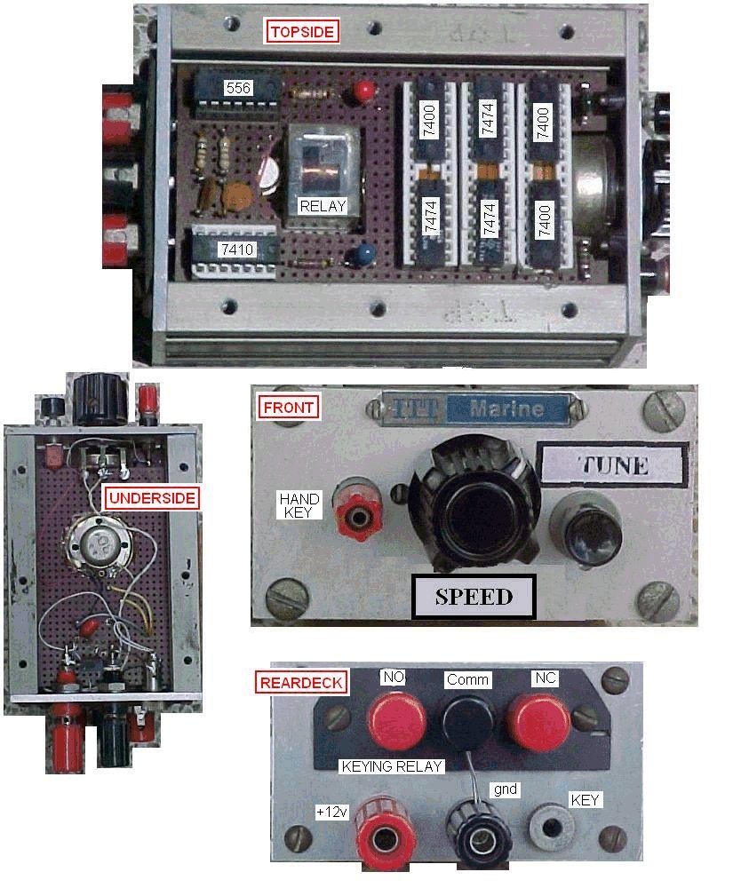 LINK TO IAMBIC KEYER CIRCUIT This is the American "Accu-Keyer" design which appeared pg 362 of 1975 ARRL Radio Amateurs Handbook. The only change I made from the original was to use an LM556 (dual timer); one half being the oscillator (original used a cross-coupled multivibrator with discrete transistors) and the other half as a 1 KHz 'sidetone' oscillator driving a very small loudspeaker. |