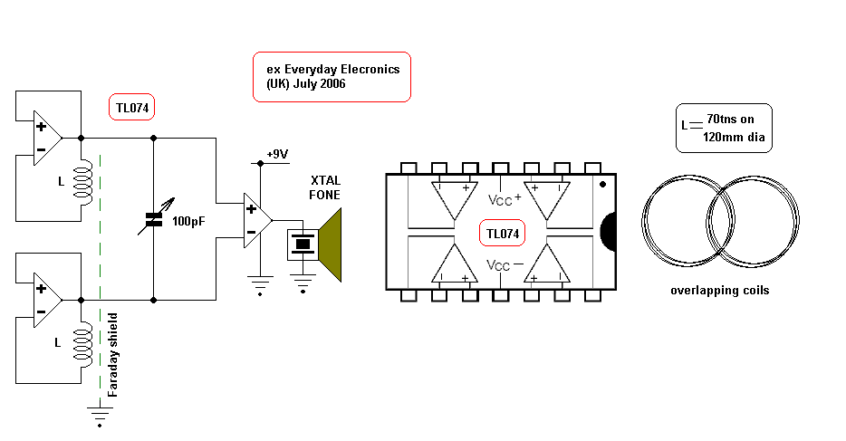 As the search coil is moved around, the capacitance between it and the ground or other objects changes. This changing capacitance "pulls" the oscillator frequency and can completely swamp-out the small change in inductance we are looking for. The coil can be screened from this capacitance effect by using a FARADAY SHIELD around the coil. This consistsof a ring of tubing, or a wrapping of aluminium foil around the coil but broken at one point, so it does not make a shorted turn. This shield is then connected to the common supply rail (0V) of the circuit.