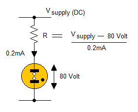 When used as a simple power on indicator, the neon needs about 0.2mA current, and show about 80 volt across its terminals.