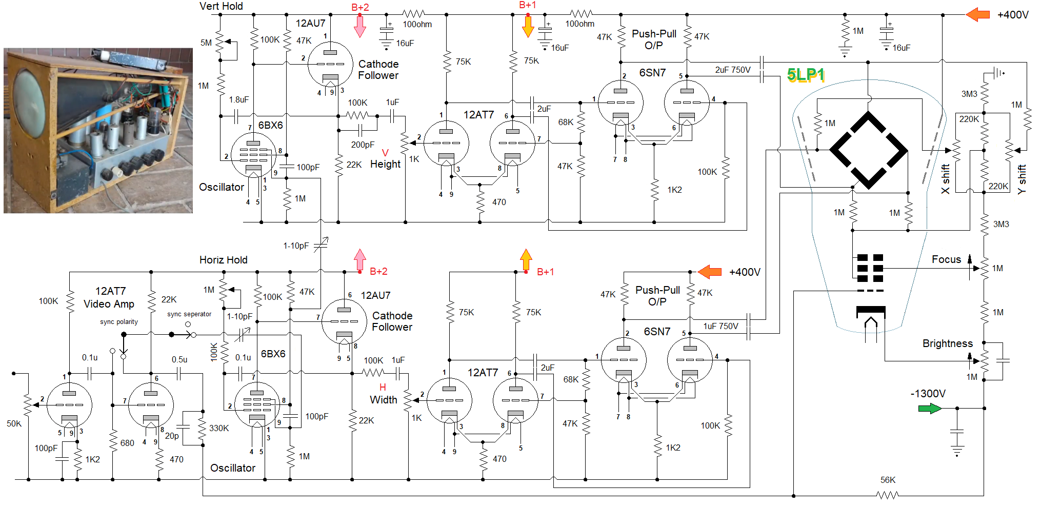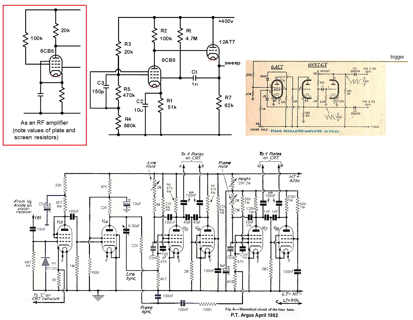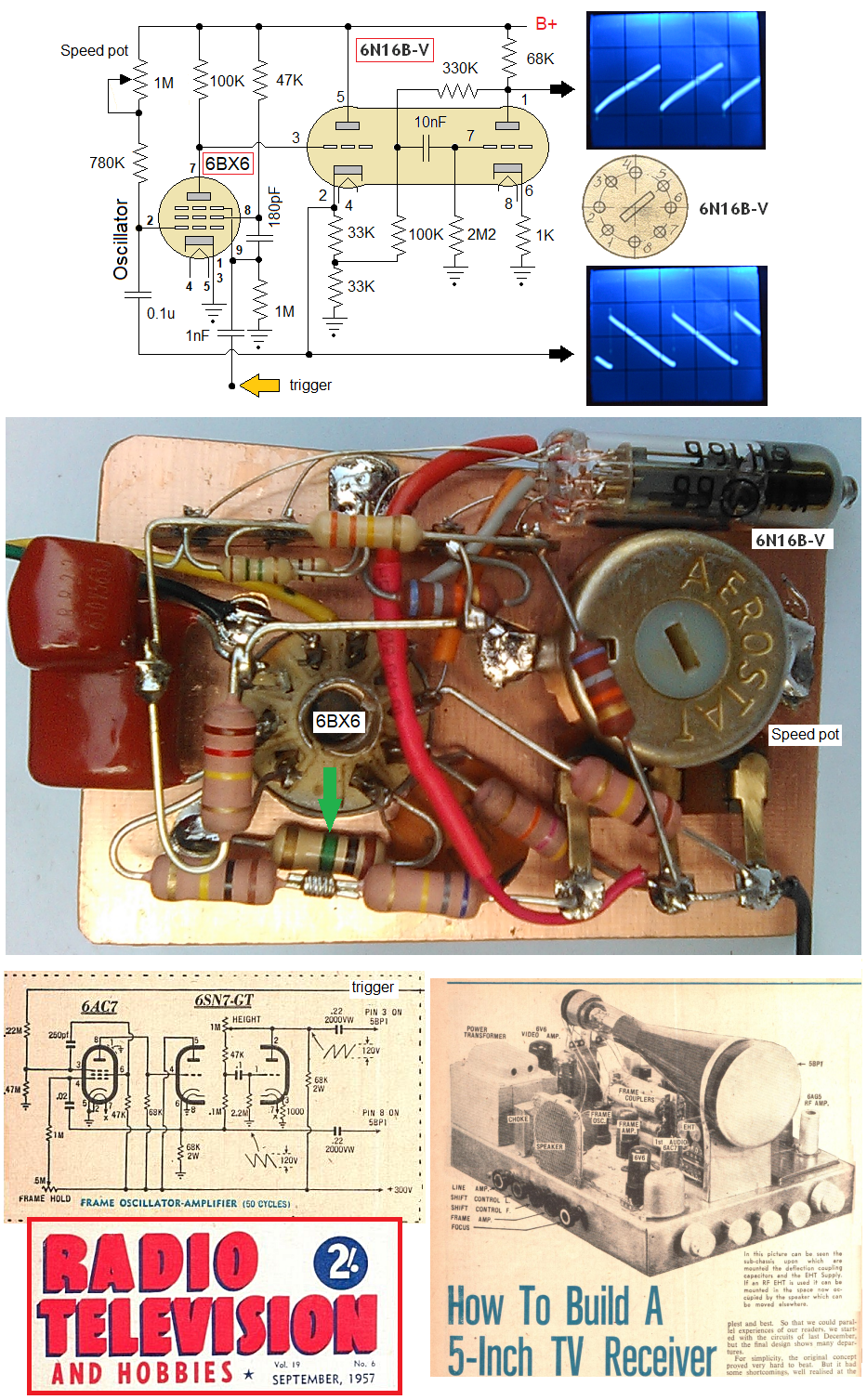 This test set-up uses a 6BX6 pentode and a The 6N16b-V has similar specs' to a 6SN7 or a 12AU7, with which we are familiar. It is basically the frame oscillator circuit from the RTV&H; 1957 TV design. The phantastron oscillator feeds a triode cathode follower, as in test-jig Mk 2, and the other triode is configured as a simple amplifier/inverter. This gives two "complementary" sawtooth outputs of opposite phase. This means effectivley double deflection voltage-swing for the CRT tube, AKA a push-pull type configuration. Origin of term: Phantastron Dr F.P. Williams was a young wartime radar boffin. He was well known for his birds-nest breadboard circuits which often left the board, trailed across the bench, and over the edge. He was also known to comment on circuits with "Oh! Very sanitary!" or "Phantastic!" In those days, time bases and the delay of pulses tended to depend on an exponential rundown due to the simple RC arrangements used. He worked on linearising the rundown to improve stability, by using "Miller" feedback. His pulse-stretching circuit using 2 pentodes + 2 diodes was named the very sanitary Sanatron and the single pentode version became the phantastic Phantastron. Explanation of Miller Effect Assume valve cut-off as grid is biassed well negative. Capacitor Ct will charge accordingly. When grid made much more positive (i.e. +ve pulse) Valve conducts, capacitor discharges (linearily). Anode voltage falls; this fall is fed back thru capacitor Ct which will tend to oppose the original change of grid polarity. This effect means that the grid voltage in fact varies almost nil! However; the anode voltage falls in a linear fashion until anode bottom is reached THEREFORE; the voltage decrease is linear because the discharge current through the capacitor is constant! Circuit derives its name from Miller effect (in vacuum tubes) which multiply's grid-plate capacitance by (µ +1) the actual (small) grid-plate capacitance; (this is nullified by a screen grid). The operation of the circuit can also be controlled by variation of the suppressor grid voltage. Edwin Armstrong discovered in 1915 that oscillation occurs in triode amplifiers by this inter-electrode capacitance when the anode load was inductive (and below resonance) In 1919 John Miller of the US bureau of standards presented a mathematical analysis of the phenomina and the effect that now bears his name! References: Negative resistance: A mystery of the backward bending curve M G Scroggie Negative resistance: further information M G Scroggie Dynatron and Transitron oscillators ARGUS Televisor Dr H. Holden (phantastron timebase) All-valve 1-inch oscilloscope (phantastron timebase) Video detailing Australian SSTV experimenters in 1970's Australian handbuilt SSTV monitor c1972 which uses phantastron timebase circuits: Click to enlarge.