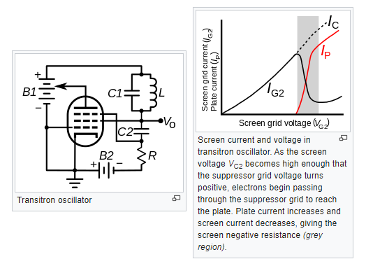 Transitron Oscillator The transitron oscillator, described by Cledo Brunetti in 1939, (similar effect observed in tetrodes by Balthasar van der Pol in 1926, also Edward Herold described a similar oscillator in 1935) is a negative resistance oscillator circuit using a pentode vacuum tube, in which, instead of the plate, the screen grid has negative resistance due to being coupled to the suppressor grid. See the circuit below In the transitron, the screen grid is biased at a positive voltage (battery B1) above the plate voltage while the suppressor grid is biased negatively (battery B2), at or below the cathode voltage. Therefore, all the electrons will be reflected by the negative suppressor grid and none will get through to the plate. The reflected electrons will instead be attracted to the screen grid, so the screen current will be high while the plate current will be zero. However, if the suppressor grid voltage is increased, as it approaches zero (the cathode voltage) electrons will begin to pass through it and reach the plate, so the number diverted to the screen grid, and thus the screen current, will decrease. Since the other grids don't take significant current the cathode current Ig2 = Ic - Ip The division of current between the screen grid and plate is controlled by the suppressor voltage. This inverse relationship is indicated by saying the transconductance between the screen and suppressor grid ,the change in screen current IG2 divided by the change in suppressor voltage (VG3) is negative. Since the suppressor grid voltage and not the screen grid voltage controls the screen current, if the suppressor and screen grid are coupled together with a capacitor (C2) so there is a constant potential difference between them, increasing the screen grid voltage will increase the suppressor voltage, resulting in a decrease in screen current. This means the screen grid has negative differential resistance with respect to the cathode, and can be used to create oscillations. In the transitron circuit, the screen and suppressor grids are coupled with a capacitor (C2) which has a low impedance at the oscillation frequency, so they have a constant potential difference. The parallel tuned circuit (C1-L) is connected between the screen grid and the cathode (through battery B1). The negative resistance of the screen grid cancels the positive resistance of the tuned circuit, causing oscillations. As in a dynatron oscillator the control grid can be used to adjust the negative resistance.