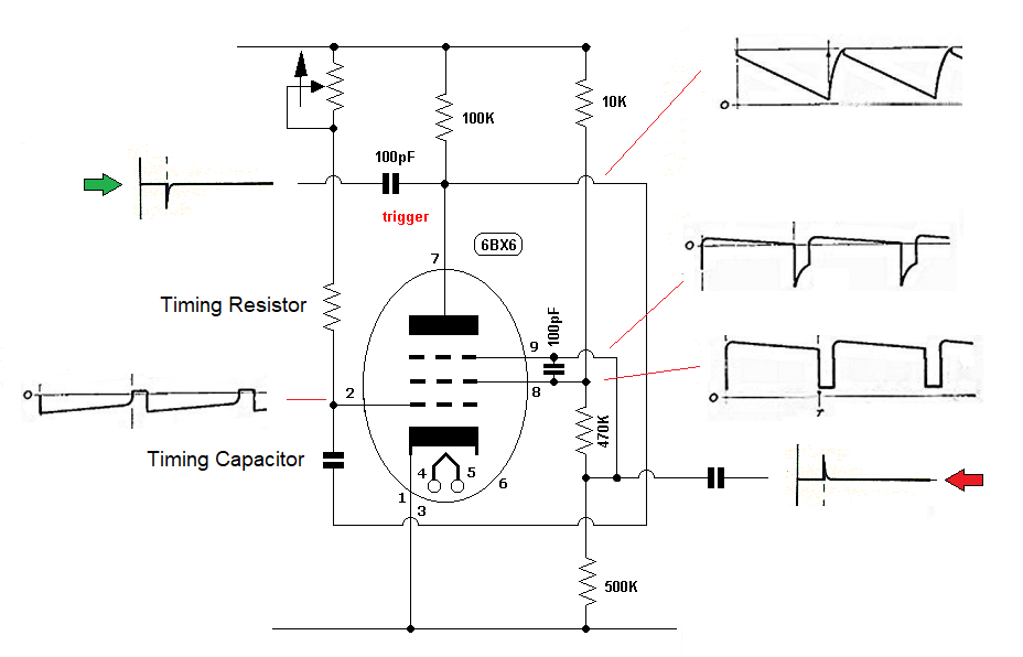 Initially the suppressor voltage is low and no plate current flows, with the electron flow within the valve being delivered to the screen. Therefore the screen voltage is low, and the anode voltage is high. When a negative going trigger pulse is AC coupled to the anode; it is also coupled to the control grid thru the timing capacitor. At this point both screen and suppressor voltage flip high (current reduces) electron flow within the valve then delivers to the anode, and anode voltage starts to fall (in a linear manner) The rate of voltage fall is determined by the timing resistor and capacitor. The voltage decrease is linear because the discharge current through the capacitor is constant. When the anode voltage falls to a low value then the electron flow returns to the screen grid Circuit action must then be re-initiated by the next trigger pulse. A positive going trigger pulse to the suppressor will also initiate circuit action. Oscillator Test-Jig Mk 1