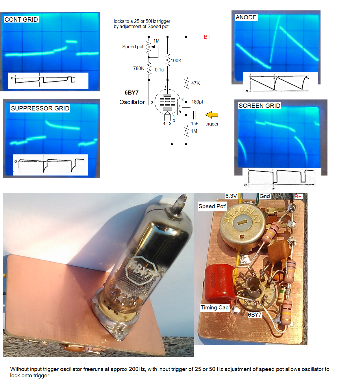 For the circuit shown, I can adjust the "speed pot" to lock onto both 25 and 50Hz square wave input trigger signal (either end of pot travel). Some designs show a 470K resistor in parallel with the screen/suppressor coupling capacitor. I found by including same, rendered the circuit unable to "lock" and it reverted to a 200Hz reduced amplitude sawtooth O/P signal? Oscillator Test-Jig Mk 2