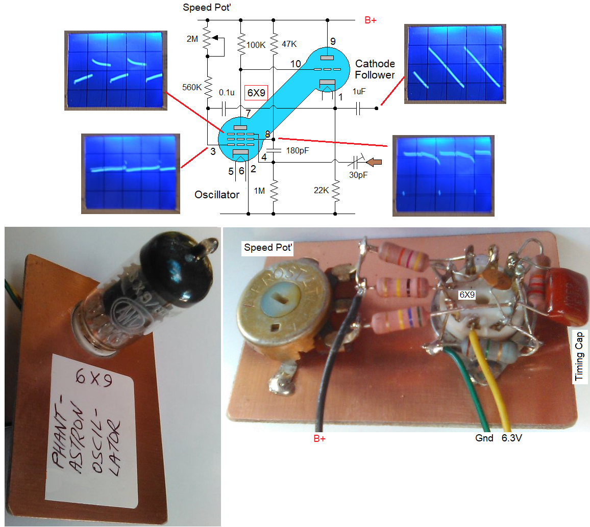 This test set-up uses a single 6X9 valve which is a pentode and triode in one glass envelope. Other types of triode-pentode valves (like 6BL8 etc) have the suppressor grid internally strapped to the cathode, and are thus, unfit for purpose! The 6X9 is a 10 pin (oddball) minature "TV" valve from the 1960's Very hard to source the correct 10 pin socket to suit the valve! Now we can evaluate the cathode follower version of the standard design. Compared to test-jig Mk 1: the flyback time seems much reduced. Also (without trigger input) the free-running frequency is stable and variable from 30 to 140 Hz over the range of speed pot' adjustment. So it would seem the addition of the cathode follower stage is worth the effort. Oscillator Test-Jig Mk 3