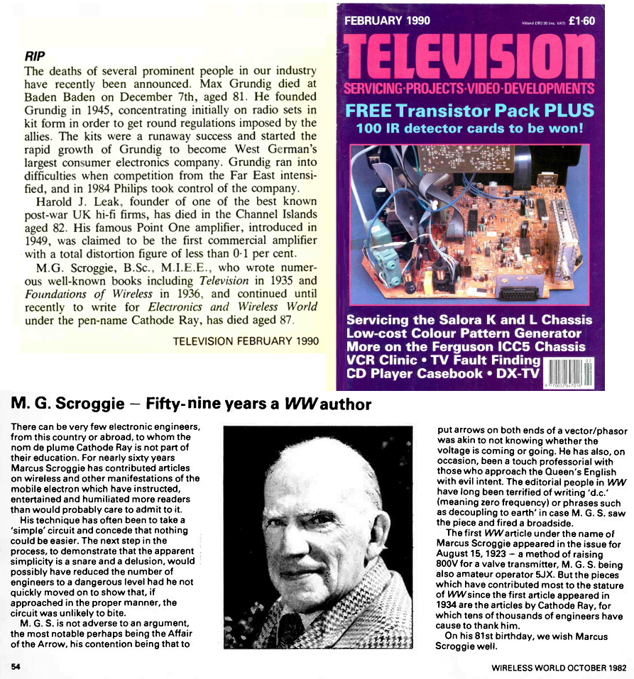 M.G. Scroggie, B.Sc, F.I.E.E. 1902 - 1989, AKA "Cathode Ray" author and radio engineer. Marcus Graham Scroggie was born in Leytonstone, England in 1902, and educated at George Watson's College, Edinburgh and Edinburgh University, graduating in 1922, with a degree in Electrical Engineering. As a radio enthusiast with the callsign (G)5JZ, he was the second amateur to communicate from Scotland to North America. After practical training at Bruce Peebles Ltd, and Creed Telegraph Co, he became Chief Engineer (1928 to 1931) of Burndept Wireless Ltd, one of the constituents of the original British Broadcasting Co. In 1939 he joined the RAF as a radar officer and was in command of a system of three Chain Home radar stations on the SE coast including Pevensey. Then at No 9 R.A.F. Radio school (Radar), before going to the Air Ministry; where he was responsible for all secret radar and radio publications and security classification. He rose to the rank of Squadron Leader. He is the author of Foundations of Wireless, Principles of Semiconductors, the Electron in Electronics, Phasor diagrams, second thoughts on radio theory, Essays in Electronics and since 1923 about 800 technical articles in Wireless World and other journals. His writing was characterised by lucid explanations of technical matter, de-bunking of fallacies and advocacy of consistent and unambigous terminology. His recreation was music. He married Mary Catharine Howie Wood, whom bore him three daughters. In 1945 he returned to civilian life as a consultant and author, with his own laboratory at Bromley, Kent. (below) Apparently British magazine "Television" published an obituary for M G Scroggie in the February 1990 edition (pg 294). If anyone has a copy ? --------- I'd like to read it. Update 31 May 2018; thanks to Mick Maytum who found the above obituary on-line at http://www.americanradiohistory.com/Archive-Practical/Television/90s/Television-1990-02.pdf ![]() Such a brief mention for someone who tutored so many. � 3Q 2018 |