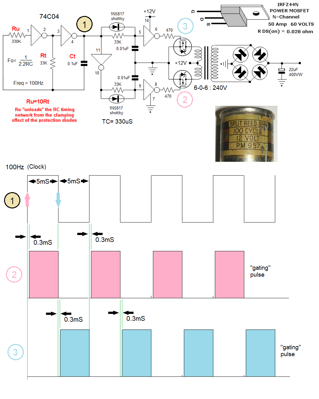 A CMOS integrated circuit (74C04 Hex inverter) oscillator provides a 100Hz clock pulse. (equal mark/space ratio 1:1) I also tried other IC's like 4069, 74HC7404, which are pin compatible and also work well. However the HC high speed cmos is restricted to a 5 volt max supply rail. This frequency is the same as the mechanical vibrating reed inside the vibrator. The vibrator contact behaviour is a break before make action. The electronic circuit should emulate that of the vibrator which it is replacing. This is acheived in the electronic circuit by the R-C-diode network and inverter. 33K 0.01uF and 1N5817 schottky diode See diagram for waveforms. With the values shown a 300uS delay is introduced at the onset of each "gating" pulse that alternately turn on each MOSFET This is the needed "commutation" and prevents both Mosfets being gated on simultaneously, at switch-over point. This would be like a brief short circuit across transformer primary. After prolonged use power dissipated in the Mosfets could exceed their specification. Because of power MOSFETs very low "on" resistance; almost all of the available voltage is impressed across each half winding of the primary, cycle by cycle. There are well designed solid-state vibrator replacement assemblies now available (see references - below) Most seem to use a PIC microcomputer to achieve the needed pulse rate & widths etc which then gate on the Power Mosfets. The above being a hardware only design, any variation in clock frequency, and delay is achieved by changing of the appropriate "timing" resistance.